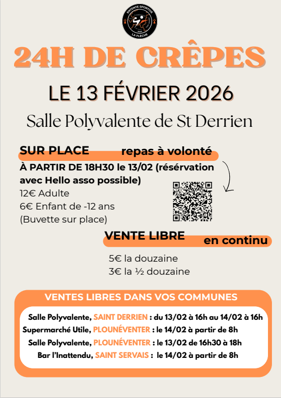 24H DE CRÊPES ST DERRIEN de 13 février 2026, 18 h 30 min à 14 février 2026, 18 h 30 min Actualité Agenda
